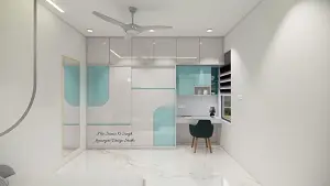 In this image there is a wardrobe with study unit. The wardrobe is made in a high gloss shuttle white and aqua color. It's a slider type wordrbe. In the left side a floating table with keyboard drawer and a wall unit with open units made up with high gloss aqua laminate. And, above all its coverd with lofts