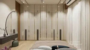 A view of the bedroom highlighting a large wall of floor-to-ceiling beige wardrobes with gold vertical pattis and sleek black handles, showing a moon-shaped mirror with a console.