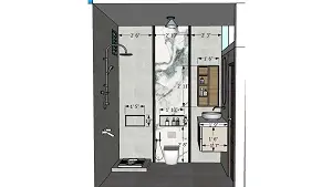 2D front elevation working drawing of the complete washroom layout — showing exact dimensions of Indian commode, western commode with glass partition, handwash vanity with mirror and shower area for precise on-site execution.