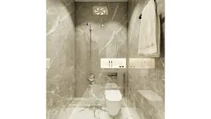 WC with niche storage with full wall tiles of grey italian marble texture, right wall we can see towel hanger,for flooring white italian marble with combination of black shades.