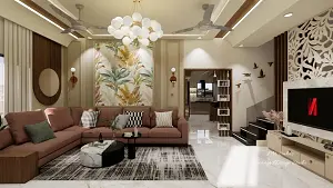 Living area view featuring an L-shaped leather sofa paired with a round marble-finish center table, grey textured carpet, and a sofa back wall designed with classical wooden beading, wallpaper, and elegant wall lights.