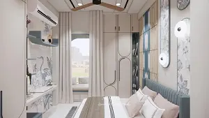 Window seating with cusion and storage at the Bottom with long grey curtains and wardrobe beside with hdhmr duco finish,bed back design on the right & study table on the left.
